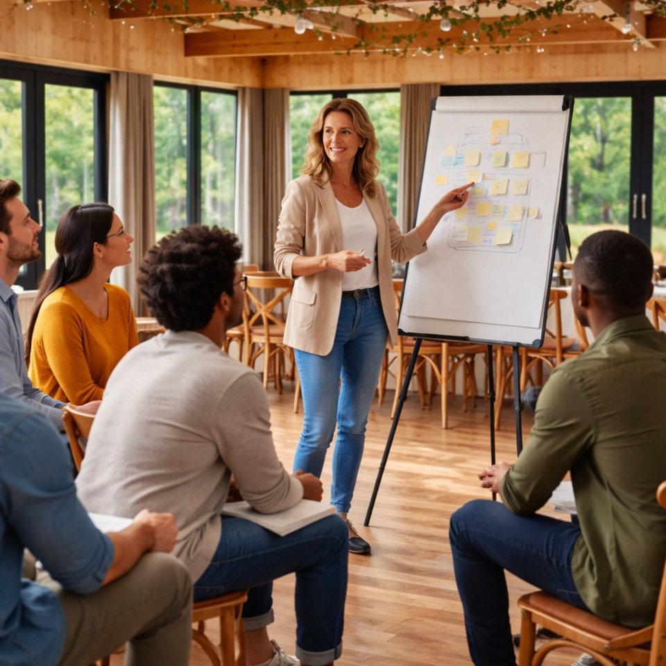 Sala konferencyjna została wyposażona w ekran, rzutnik, profesjonalne nagłośnienie oraz flipchart. Dzięki panoramicznym oknom Goście mogą cieszyć się malowniczym widokiem na otaczający las, co sprzyja koncentracji i tworzy wyjątkową atmosferę podczas spotkań.
